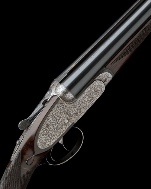 25in. nitro chopperlump barrels with matt Churchill-rib, 2 3/4in. chambers, bored approx. imp. cyl. and 1/4 choke, automatic safety, removable striker discs, gold-inlaid cocking-indicators, articulated front trigger, rolled-edge triggerguard, profusely engraved with floral and scroll engraving, bright finish, 14 1/2in. stock including 3/4in. rubber recoil pad, weight 6lb. 7oz., in a universal case