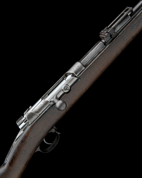dated 1886, matching numbers throughout, 31 3/4in. barrel with block-mounted blade fore-sight, rear-sight with ladder calibrated up to 1,400 metres, octagonal nocks form marked with various Imperial German acceptance marks, stamped 'ERFURT' surmounted by a crown, also marked FW surmounted by a crown for Frederick Wilhelm, King of Prussia, action sidewall marked 'I.G. MOD. 71/84' in gothic script, magazine cut-off, (original firing pin and ejector slide collar are broken, reproduction replacements are included though yet to be correctly fitted) straight-hand stock (cracked through and repaired at hand), buttplate tang marked with regimental markings indicating 24th Division Infantry Regiment. This Lot is sold with a Proof Exemption certificate as unsuitable for use