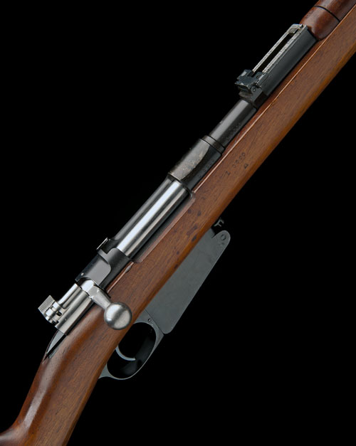 29 1/2in. nitro reproved barrel with block-mounted blade fore-sight, rear open sights with flip-up ladder calibrated up to 2,000 metres, the sidewall engraved 'MAUSER MODELO ARGENTINO 1891. MANUFACTURA LOEWE BERLIN.', short upper hand guard, blued bolt release, magazine lock screw, straight-hand stock, sling swivels, 13 1/4in. pull including blued steel buttplate