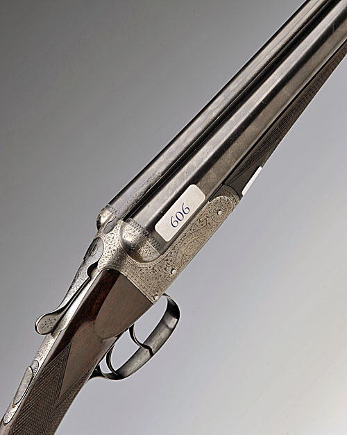 30in. nitro reproved barrels (some dents), 2 1/2in. chambers, bored approx. imp. cyl. and 1/2 choke, treble-grip action, automatic safety, beaded and feathered borderwork surrounding acanthus scroll engraving, brushed bright finish, 13 3/4in. figured stock