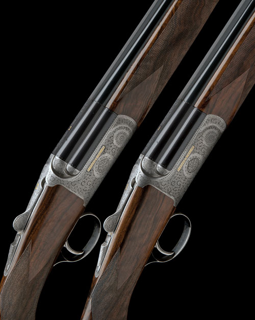 28in. nitro barrels with 7mm solid matt top-ribs gold-inlaid '1' and '2' and with flashes of acanthus scroll engraving at the breech ends, 2 3/4in. chambers, bored approx. 1/4 and 3/4 choke (both), hold-open toplevers gold-inlaid '1' and '2', automatic safeties with integral triggerplate release catches and gold-inlaid 'SAFE' details, non-selective single triggers, best fine bouquet and scroll engraving with the makers name inlaid in gold, the undersides gold-inlaid with the model designation, the triggerplates signed 'Chiara', 15 1/2in. highly-figured semi-pistolgrip stocks including 1/2in. rubber recoil pads, weight 6lb. 13oz. (No.1) and 6lb. 11oz. (No.2)