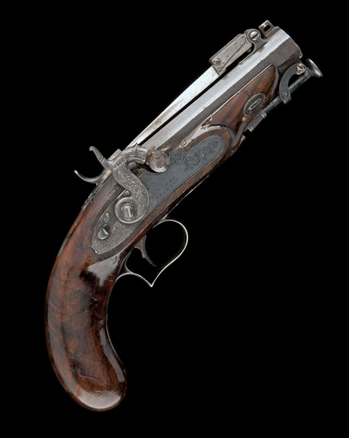 A 20-BORE PERCUSSION SILVER-MOUNTED OVER-COAT PISTOL WITH SPRUNG BAYONET SIGNED 'RICHARDS WOOD & CO', no visible serial number,