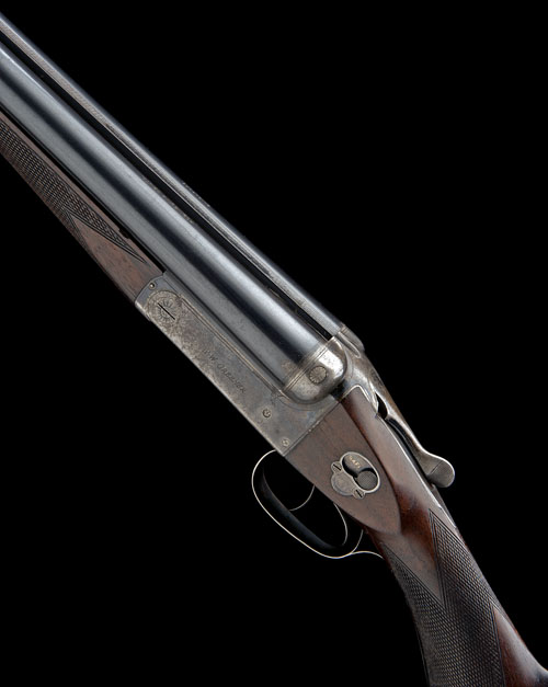 30in. nitro barrels, the rib engraved 'W.W. GREENER. MAKER. 40. PALL MALL. LONDON. WORKS. BIRMINGHAM.' and the tubes engraved 'ROBINSON & CO. LTD. SINGAPORE', 2 3/4in. chambers, bored approx. imp. cyl. and full choke, treble-grip action, manual side-safety with inlaid 'SAFE' detail, border engraving, retaining traces of original colour-hardening and finish, 14 1/4in. semi-pistolgrip stock including buttplate, weight 7lb. 14oz.