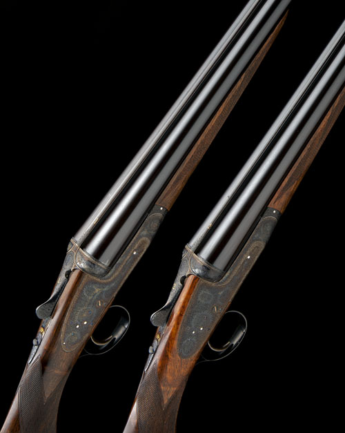 28in. nitro chopperlump barrels, concave game ribs engraved 'BOSS & CO. 13, DOVER STREET, PICCADILLY, LONDON. W1 ' and gold-inlaid '1' and '2', 2 3/4in. chambers, bored approx. 3/4 choke in all, rounded bar actions, toplevers gold-inlaid '1' and '2', automatic safeties with gold-inlaid 'SAFE' details, gold-inlaid cocking-indicators, Boss 1905 improved patent single triggers, rolled-edge triggerguards, best fine bouquet and scroll engraving, retaining virtually full original colour-hardening and finish, 14 3/8in. highly-figured semi-pistolgrip stocks, weight 5lb. 15oz.