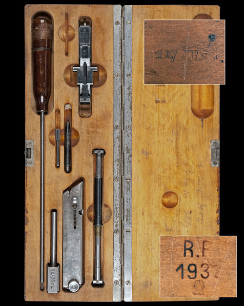 pre World War Two production, the kit comprising of a 7 1/4in. barrel insert, a replacement lightweight toggle, barrel guide, special magazine and cleaning rod (the set believed complete except for a cleaning brush), each part numbered '6' where appropriate, the guide and cleaning rod marked '13/J.R.5 1', all contained within its original compartmented wooden case measuring 15 3/4in. by 5in. approximately with push-button locking catch, the lid marked as above, the underside of box marked 'R F' (possibly 'P') over 193 (2?), over an eagle acceptance stamp under-lined with 'SU45'