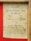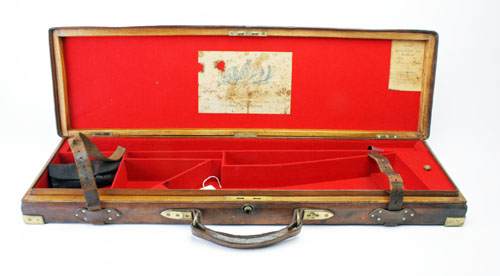 suitable for 30in. barrels, relined with red baize, brass lock (key missing), the lid interior with a 'J PURDEY ' trade label, together with a 'CHARGES' label for serial no. 10048, the lid exterior with a brass escutcheon and the monogram 'F.L.'