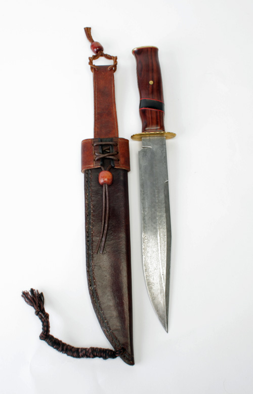 A CUSTOM BOWIE TYPE KNIFE WITH DAMASCUS STEEL BLADE,