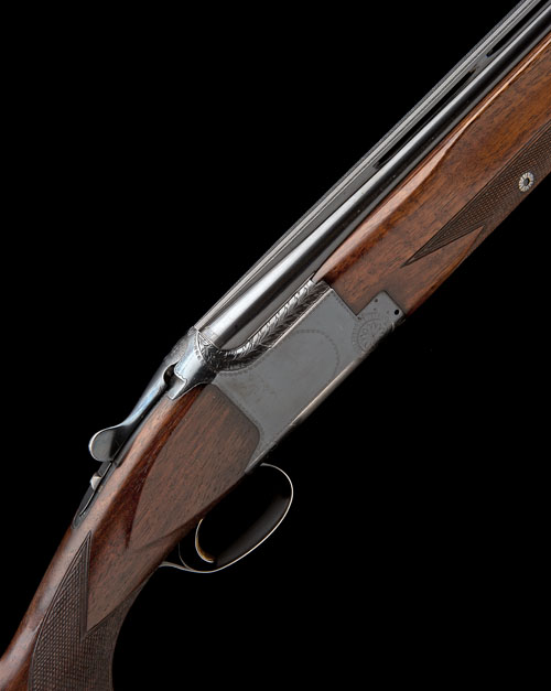27 1/2in. nitro barrels with 12mm ventilated matt top-rib, 2 3/4in. chambers, bored approx. imp. cyl. in both, hold-open toplever, manual safety with integral barrel selector switch, gold-washed trigger, blacked border engraved action, 13 1/3in. semi-pistolgrip stock including buttplate, weight 7lb. 3oz., in its case