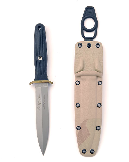 with 6in. 440-C stainless steel double-edged spear-point blade etched with Applegate and Fairbairn signatures, bead blasted finish, brass guard, grooved nylon handle, lanyard hole, with its molded nylon sheath, in its makers carton