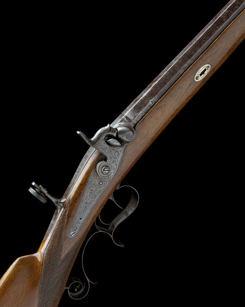 circa 1850, with octagonal 33 1/2in. barrel, the top-flat signed in silver 'H. ZAPFF IN HAMBURG', engraved muzzle-crown, dove-tailed blade fore-sight, dove-tailed standing notch rear-sight, engraved breech-block and elongated engraved top-tang with elevating adjustable peep-sight, scroll engraved back-action lock and hammer, walnut half-stock, chequered at the wrist, raised cheek-piece on the left hand side, engraved iron crescent heel-plate, engraved iron trigger-guard with scrolled pistol-grip and finger-spur, double set triggers and later wood ramrod