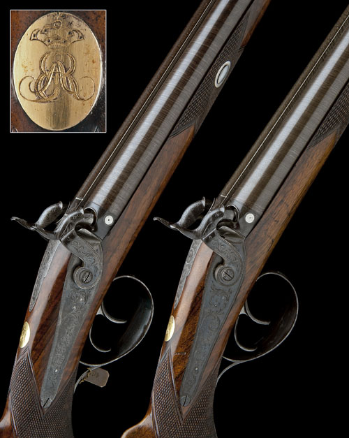 circa 1840, with re-browned (by Tatham) 30in. twist barrels, the top-ribs signed 'HENRY TATHAM JNR, 37 CHARING CROSS, LONDON', white metal bead fore-sights, platinum lines and vents at breech, fully scroll engraved top-tangs, border and scroll engraved back-action locks signed 'HY TATHAM JUNR', highly figured semi-pistol grip chequered half-stocks with raised cheek-pieces, gold oval escutcheons engraved with the crest of Ernst August Elector of Hanover, Duke of Brunswick, iron heel-plates with scroll engraved long top-tangs, circular silver floral engraved escutcheons set into the pommels of the grips, border, scroll and game-scene engraved trigger-guard bows, white-metal engraved fore-end caps and original brass tipped ramrods