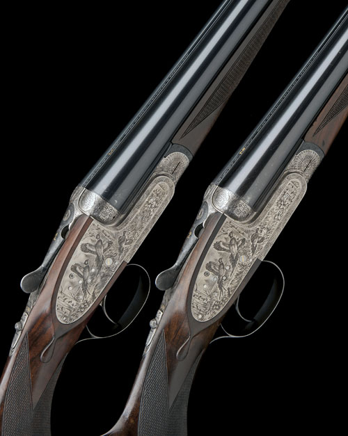 27in. nitro reproved chopperlump barrels, ribs gold-inlaid '1' and '2 at the breech ends, 3in. chambers, bored approx. 1/4 and 1/2 choke (No.1) and choke inserts 1/2 both (No.2), toplevers gold-inlaid '1' and '2', automatic safeties, removable striker discs, Gun No.1 with Holland & Holland type self-opening system, gold-inlaid cocking-indicators, non-selective single triggers, fences carved with floral bouquets, action and furniture with bouquet and scroll engraving, the sideplates with scenes of English partridge and pheasant in flight, signed 'R. CAPECE', bright finish, 14 7/8in. highly-figured semi-pistolgrip stocks including 3/8in. rubber recoil pads, weight 6lb. 1oz.