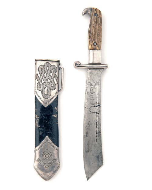 circa 1938, with heavy hatchet-shaped 9 3/4in. blade etched with the motto 'ARBEIT ADELT' (work enables) and hand engraved 'HP' on the right hand side and the makers mark beneath 'GES GESCH' together with 'RADJ' within a triangle on the left hand side, solid nickel-silver cross-guard and hilt, stag-horn scales and 'eagles-beak' pommel (blade with heavy signs of use and some polished pitting) TOGETHER WITH its original metal scabbard with nickel fittings (some denting and discolouration to chape, painted portion old re-paint with losses)