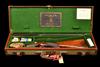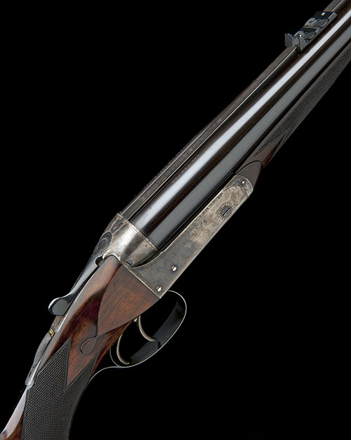26in. nitro reproved chopperlump barrels (converted from .350NE in 1979), matt sight rib engraved 'J. RIGBY & CO. 43 SACKVILLE STREET. LONDON. W. LATE ST. JAMES STREET' in gothic script, tubes engraved 'CAL. 9.3X74R REGULATED FOR 285G BULLET', open sights and two folding leaf sights with silver inlaid sighting lines and marked for 100, 300 and 400 yards, ramp-mounted bead fore-sight, elongated treble-grip action with removable striker discs, automatic safety with gold-inlaid 'SAFE' detail, border engraving, retaining some colour-hardening and finish, 14 3/4in. highly-figured pistolgrip stock with sling eyes, steel pistolgrip-cap and partially chequered steel buttplate, bolstered fore-end with grip-catch release, weight 9lb. 5oz., in its brass-cornered canvas and leather case with some accessories and sighting target
