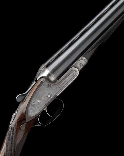 28in. nitro reproved barrels, rib engraved 'CHARLES HELLIS & SONS. 119 EDGEWARE ROAD. HYDE PARK. LONDON. W.', 2 3/4in. chambers, bored approx. true cyl. and 1/2 choke, treble-grip action, toplever engraved '2', automatic safety with gold-inlaid 'SAFE' detail, border engraving, retaining traces of original colour-hardening, 14 7/8in. full crossover replacement stock, lockplates and furniture also swept, including 5/8in. rubber recoil pad, weight 6lb. 15oz., in a pigskin leather case