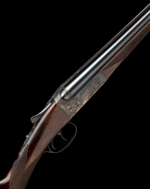 27in. nitro chopperlump barrels, 3in. chambers, bored approx. 1/4 and full choke, minor bulge right barrel, removable striker discs, automatic safety, border engraving, retaining virtually full original colour-hardening and finish, 14 1/2in. stock, weight 5lb. 4oz.