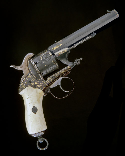 Belgian, circa 1860, with expertly reblued 5 1/2in. octagonal barrel signed on the top-flat in gold 'THEODORE STERCKX' within a gold bordered panel with arabesque terminals, gold band and dot-line at muzzle, further gold line arabesques at breech, plain ratchet-locking cylinder with a stylised flower relief engraved over each chamber and surrounded by further gold line decoration, open frame with profuse geometric gold line inlay, unusual rear-hinged left hand loading gate, offset hammer, smooth marine ivory grips (some age hairline cracks), butt-cap with dot and line inlaid decoration ensuite with the muzzle, trigger-guard bow ensuite with the frame, spring-loaded under-barrel ejector rod, the whole expertly refinished with some minor losses to inlays