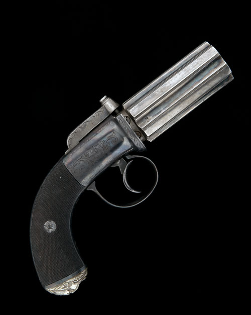 A 100-BORE PERCUSSION SIX-SHOT PEPPERBOX REVOLVER SIGNED J. WILSON, LONDON, no visible serial number,