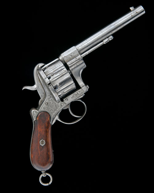 probably Belgian, circa 1855, with round 6in. barrel, blade fore-sight, octagonal breech-section, large fully-fluted scroll engraved cylinder, border and scroll engraved frame, hinged loading gate, bag-shaped grip with replacement wood grip-plates, lanyard ring at pommel, the whole brushed bright