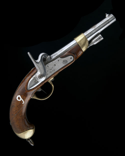 French, dated for 1857, with round tapering 8in. barrel in the white, gun number of '115' heavily stamped to top of breech, plain bar-action lock signed 'MRE IMP. ALE DE MUTZIG', plain walnut half-stock (repaired at wrist) stamped with numerous inspectors and re-issue marks, brass butt-cap with lanyard ring, brass two-piece side-plate and combined nose-cap, iron trigger-plate with brass trigger-guard bow and original iron cup-ended ramrod