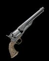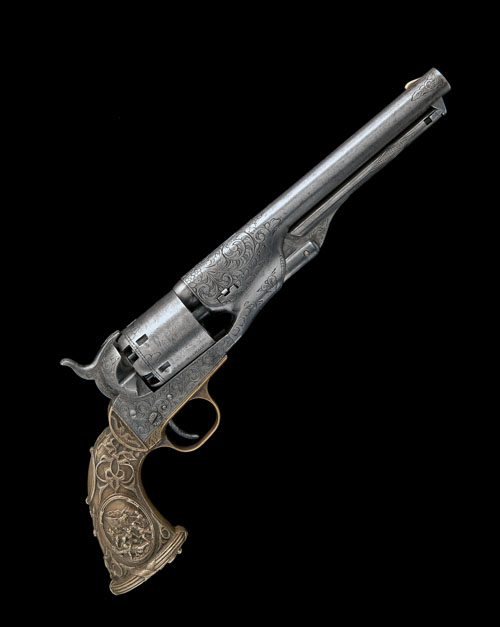 mid to late 20th century, with 7 1/2in. round barrel 'in the white' signed 'ADDRESS COL SAML COLT NEW YORK US AMERICA' (spurious), the muzzle and breech-end engraved with loose American style scrolls and foliage, plain cylinder with roll-engraved scene and additional engraved accents, iron frame engraved en-suite with the barrel, engraved screw-heads, brass engraved trigger-guard stamped 'VU' behind, relief carved brass 'Tiffany' style cast grip with an American Eagle carved in relief on the pommel and hinged under-barrel rammer with diamond chequered panels and further scroll engraving, the whole lightly stained and tarnished, British proofs