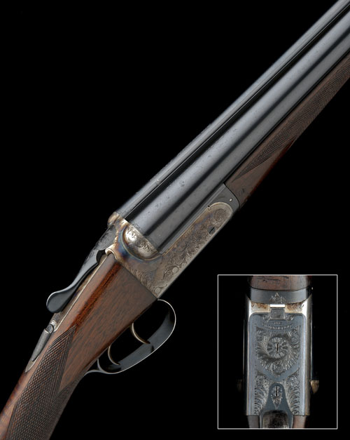28in. nitro barrels, tubes engraved 'W. & C. SCOTT GUNMAKERS. BIRMINGHAM ENGLAND', 2 3/4in. chambers, bored approx. imp. cyl. and 3/4 choke, automatic safety, border and scroll engraving, the underside with the model designation, retaining much original colour-hardening and finish overall, 15 3/8in. figured stock, weight 6lb. 2oz., in its canvas and leather case with gold-tooled W. & C. Scott trade label
