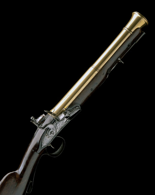circa 1790, with substantial triple-staged barrel, banded at the transitions and cannon muzzled, the top near breech engraved with a knightly shielded coat of arms (indistinct), reinforced breech with iron top-tang, slightly curved and radiused lockplate signed 'REYNES A BAYONNE' within a field of scrolls (rubbed), waterproof pan with drain, walnut full-stock with iron furniture (cheek-piece dished), raised trigger-guard tang and original wooden ramrod