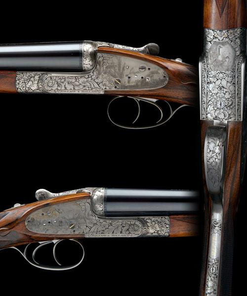 30in. nitro chopperlump barrels, rib with deep acanthus scroll motifs at the breech end, tubes engraved 'HOLLAND & HOLLAND. BRUTON STREET, LONDON.', 2 3/4in. chambers, bored approx. 1/4 and 1/2 choke, automatic safety with gold-inlaid 'SAFE' detail, gold-inlaid cocking-indicators, rolled-edge triggerguard, action, furniture and lockplates profusely engraved with bold leaf and scroll motifs on a matt background, surrounding very finely engraved game scenes of mallard, greylag and Canada geese in woodland and wetland settings, the fore-end engraved en suite, triggerplate signed 'Paul Chung', bright finish overall, triggerguard tang gold-inlaid with the serial number, 15 1/4in. boldly-figured stock, weight 7lb. 3oz., in its lightweight leather motor case