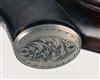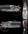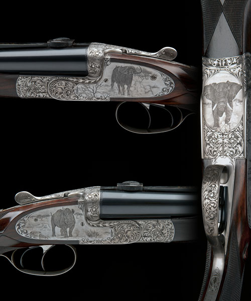 26 15/16in. nitro barrels with matt sight rib gold-inlaid '470 N-E', open sights with one folding leaf sight, ramp-mounted bead fore-sight with fold-over moonsight, mounted with a Docter red-dot sight mounted on a plate to fit quickly-detachable claw mount bases, left barrel gold-inlaid 'Ernest Dumoulin Herstal Manufacture d'armes de Luxe', treble-grip action with side-bolsters, removable striker discs, manual safety with gold-inlaid 'SAFE' detail, articulated front trigger, action and furniture deeply carved in relief with scrolling acanthus motifs on a matt background, the lockplates finely engraved with scenes of buffalo and rhino, the underside with a charging bull elephant, the triggerplate signed 'V. Grojean', bright finish, 15in. well-figured pistolgrip stock with cheekpiece, engraved steel pistolgrip-cap, sling eyes and including 1in. rubber recoil pad, beavertail fore-end, weight 11lb. 2oz.
