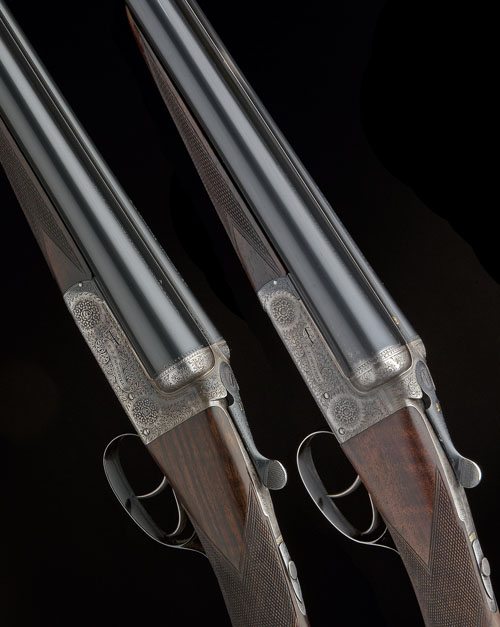 26 1/2in. nitro barrels (No.2 nitro reproved), the ribs gold-inlaid '1' and '2', the tubes engraved 'E.J. CHURCHILL (GUNMAKERS) LTD. ORANGE ST. GUNWORKS. LEICESTER SQUARE. LONDON.', 2 1/2in. chambers, bored approx. 1/4 and 1/2 choke (both), treble-grip actions with hidden third bites, toplevers gold-inlaid '1' and '2', automatic safeties with gold-inlaid 'SAFE' details, fine bouquet and scroll engraving, retaining traces of original colour-hardening and finish, 15 3/4in. figured stocks (No.2 a replacement and cracked at hand), weight 6lb. 2oz. (No.1) and 6lb. 11oz. (No.2), in their leather 'VC' double motorcase