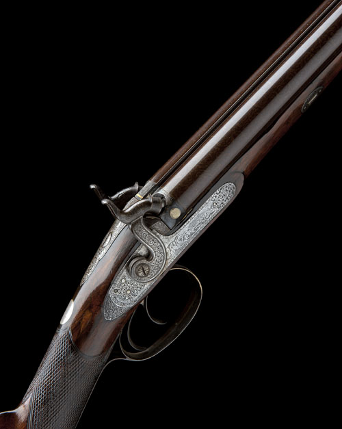 circa 1850, with re-browned 30in. damascus barrels, the top-flat signed 'PRYSE & REDMAN, MAKERS TO THE HONORABLE BOARD OF ORDNANCE, LONDON' (rubbed), scroll engraved breech-end and top-tang, nickel vents, border, scroll and game-scene engraved brushed bright bar-action locks, figured walnut half-stock chequered at the wrist with silver oval escutcheon to the top (cracked below left hand lock), engraved iron heel-plate, scroll engraved trigger-guard and ramrod throat, missing ramrod.
