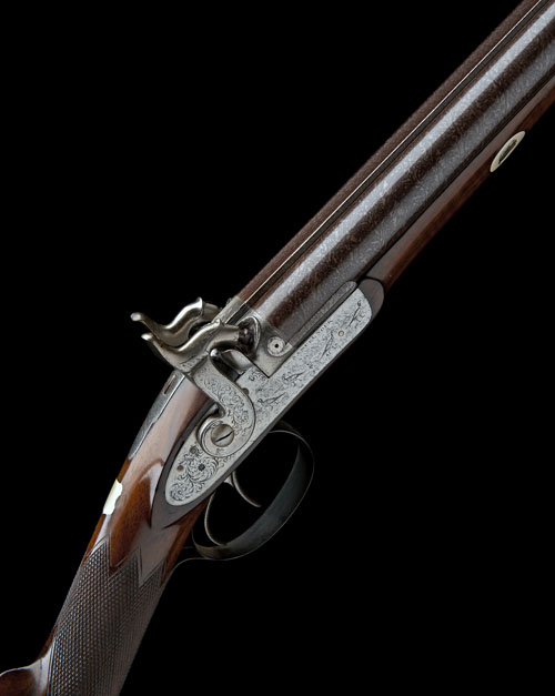 first half of the 19th century, possibly converted from flintlock, with re-browned 30in. damascus barrels, scroll engraved brushed bright breech-ends, platinum vents, scroll and game-scene engraved brushed bright bar-action locks signed 'SAMUEL NOCK', figured walnut half-stock re-chequered at the wrist with shield shaped escutcheon to the top, re-blued iron heel-plate, profusely scroll engraved re-blued trigger-guard (possible replacement) and later ramrod