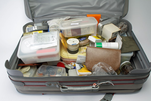 A LARGE COLLECTION OF FISHING RELATED ITEMS AND FLIES, including eight boxes of assorted flies, fly assembly items, feathers and furs in a grey suitcase