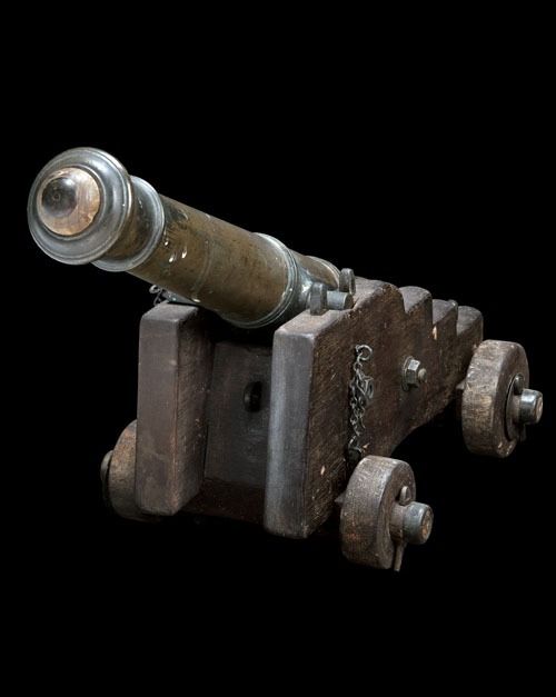 English circa 1850, period London proofs, with banded cannon-muzzled 26 1/4in. barrel including the looped cascabel, sunken touch-hole reduced diameter trunnions, the left stamped '2', good age patina and retaining its original bronze-mounted wooden muzzle-plug TOGETHER WITH a period four wheeled wooden trolley in the naval style possibly original to the barrel (missing one trunnion clamp)