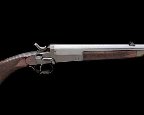 28in. black powder only octagonal barrel, matt top flat with open sights and two folding leaf sights, white metal inlaid sight lines and marked for 50, 100 and 150 yards, bead fore-sight, the breech end engraved 'G.E. LEWIS. 32. & 33. LOWER LOVEDAY ST. BIRMINGHAM. NO. 8387', action with basketweave engraving with central cartouches engraved 'G. E. LEWIS', blued finish, 14 1/8in. figured pistolgrip stock with engraved steel pistolgrip-cap, fore-end with Anson push rod release and sculpted horn finial, weight 5lb. 9oz.