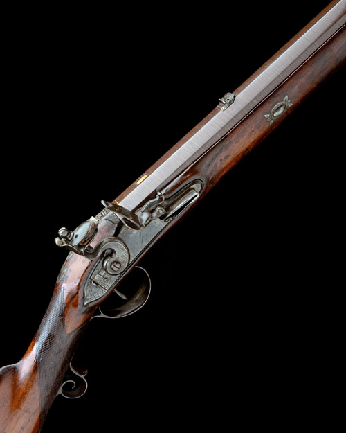 circa 1785 with re-browned octagonal 28 1/4in. barrel (possibly shortened), makers gold poincon (defaced) inlet at breech together with two yellow-metal lines, dove-tailed blade fore-sight, standing notch rear-sight with additional leaf, border, floral and trophy engraved top-tang, flat, slightly curved bevel-edged lockplate with rubbed signature, stepped pointed tail with engraved trophy, hammer with sliding safe to the rear, semi-rainproof pan, walnut half-stock chequered at the wrist with old plated repair forwards of the side-nail, large plain iron heel-plate, iron trigger-guard bow, the tang with scrolled hand-stop, engraved white-metal fore-end tip and turned ramrod pipes with period brass-tipped mahogany ramrod