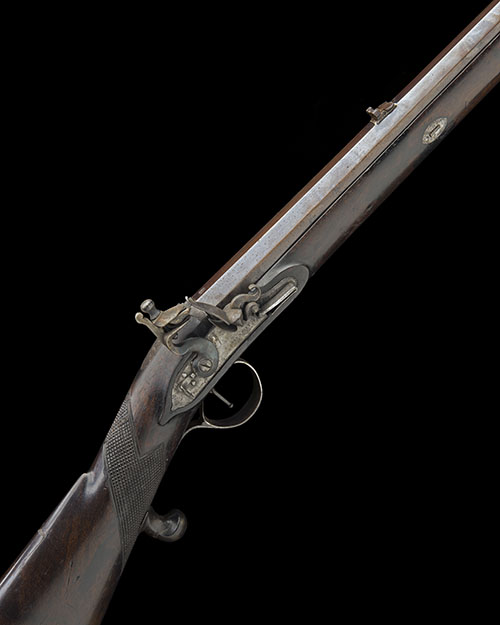 Continental, circa 1790 with possible later modifications, re-browned slightly swamped octagonal 29 1/2in. barrel, makers or possible guild mark of a rampant lion within a shield stamped at breech, dove-tailed brass fore-sight, standing notch rear-sight with additional leaf, plain top-tang, flat, slightly curved bevel-edged lockplate signed 'BRUMMITT' (refreshed), stepped pointed tail, replacement hammer with sliding safe to the rear, rainproof pan, walnut half-stock chequered at the wrist with shallow comb and raised cheek-piece, large plain iron patch-box to right hand side, iron heel-plate tapering towards the heel, iron trigger-guard bow, the tang with applied horn hand-stop, horn fore-end tip and turned ramrod pipes with period iron ramrod