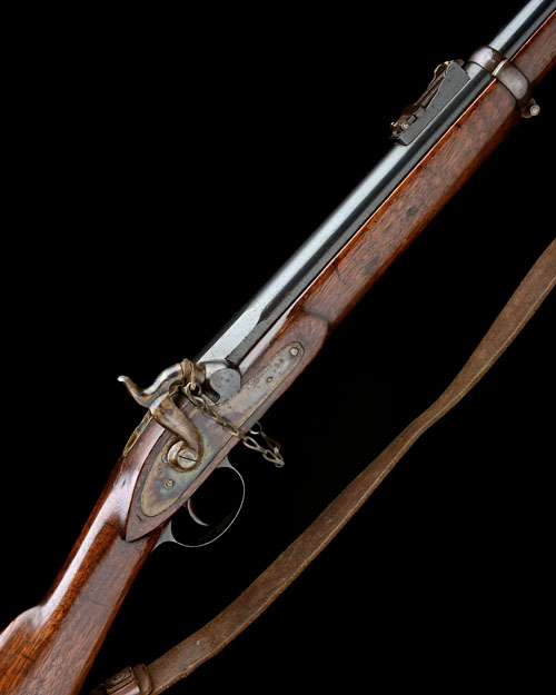 circa 1860, with blued 33in. barrel rifled in five grooves, block and blade fore-sight, elevating ladder rear-sight graduated to 1000 yds, octagonal breech-section, borderline engraved colour-hardened military-style lock signed 'W.W. GREENER' (possibly refreshed), early style hammer, walnut full-quarter stock with exposed muzzle, iron furniture including two barrel-bands, the front with bayonet-lug, iron nose-cap and jag-ended iron ramrod, complete with period leather sling, the whole being an older re-finish (some pitting present)
