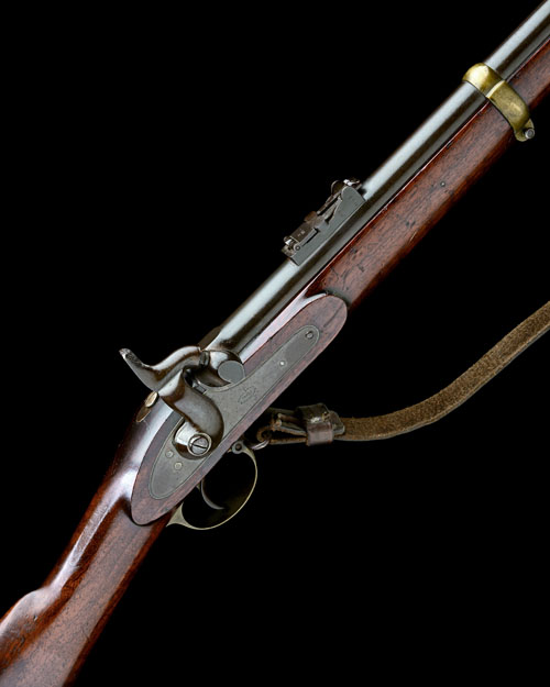 circa 1855, with blued 39in. barrel rifled in three grooves, block and blade fore-sight, varient rear-sight graduated to 500 yds., with sliding elevator, Birmingham proofs, borderline engraved military-style locks signed in an oval 'SMALL ARMS TRADE BIRMINGHAM' (traces of colour), walnut three-quarter stock, brass furniture including three barrel-bands of similar widths, brass nose-cap and jag-ended iron ramrod, complete with period leather sling