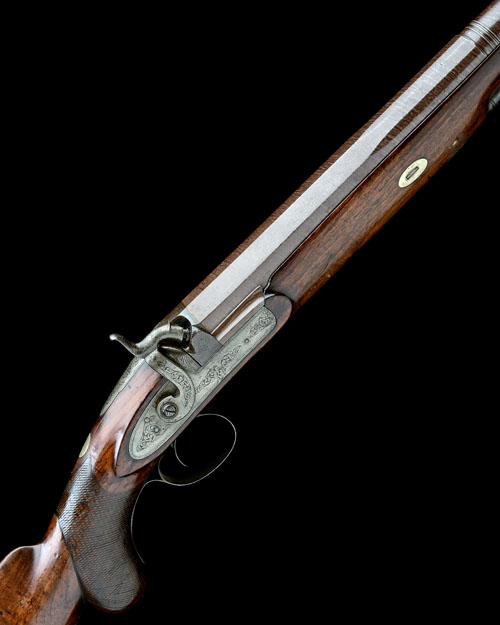 circa 1850, with triple-staged twist iron 32 1/2in. barrel, the top-flat signed 'EBRALL & SON' (rubbed, faint), moulded bands at the intersection, bead fore-sight, borderline and scroll engraved breech, borderline and scroll engraved top-tang, bar-action border and scroll engraved unsigned lock, scroll engraved hammer, walnut half-stock with chequered half pistol-grip, iron furniture, white-metal oval escutcheon to wrist and twin barrel keys, moulded horn fore-end tip and replacement brass-tipped ramrod