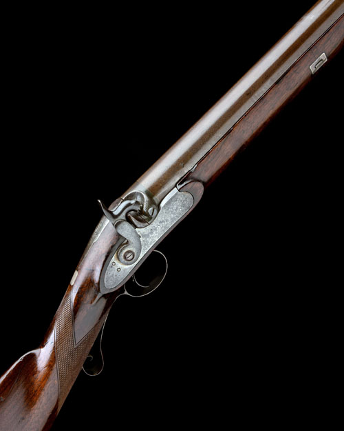 circa 1840, possibly converted from an earlier flintlock, with round tapering 46in. barrel signed 'GEO WEST LOUTH', plain breech with screwed plug, plain top-tang, plain slightly curved lock with moulded hammer, walnut half-stock chequered at the wrist, iron furniture including raised scrolled trigger-guard tang, plain iron thimbles and period ramrod