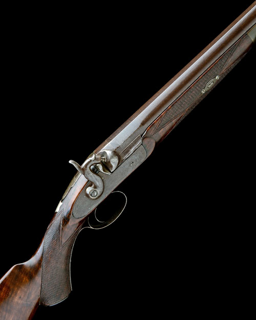 English, circa 1860, with round, tapering damascus 32in. barrel, bead fore-sight, full-length flat sighting-plane, squared patent breech, borderline and scroll engraved top-tang, border and scroll engraved bar-action lock (traces of signature), plain, probable replacement hammer, chequered walnut half-stock with full pistol-grip, iron butt-plate (face pitted) with short top-spur, iron trigger-guard with full-length tang, splinter fore-end with moulded horn tip and no provision for ramrod