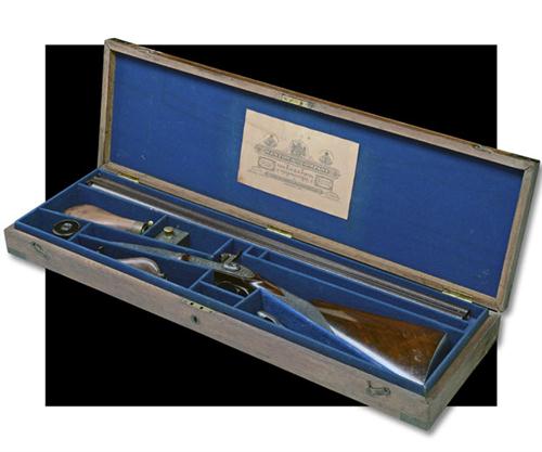 A CASED 14-BORE PERCUSSION DOUBLE-BARRELLED SPORTING-GUN, no visible serial number,