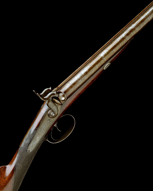 A CASED 16-BORE PERCUSSION DOUBLE-BARRELLED SPORTING-GUN, no visible serial number,