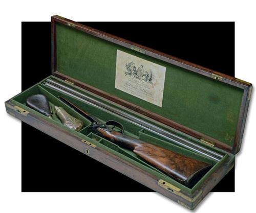 for 1826, probably converted from tubelock, with 30in. twist-iron barrels, the top-rib signed 'JOSEPH MANTON PATENT, HANOVER SQUARE, LONDON', bead fore-sight, floral engraving and bands to the breech, platinum plugs, engraved top-tang, flat, slightly curved bevel-edged border and scroll engraved bar-acton locks with rounded stepped, flat-pointed tails, both locks signed 'JOSEPH MANTON' over the line of an inlet to the front of the plates, slab-sided scroll engraved patent hammers with detachable noses, walnut half-stock chequered at the wrist, engraved iron furniture and period brass-tipped ramrod TOGETHER WITH a walnut storage box (possibly the original), compartmented and lined in green baize (renewed in antiquity) and complete with two flasks, a nipple-key and sundry cleaning items