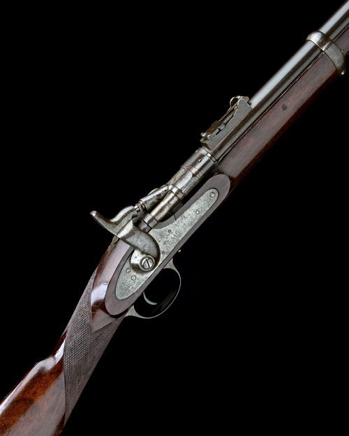dated for 1870 and retailed by the London Small Arms Co., with 30 1/2in. sighted barrel, flip-open breech stamped 'WR' together with a broad arrow, plain military-type lock signed 'L.S.A. Co 1870' and stamped with a 'VR' crown cypher to the tail, walnut three-quarter stock chequered at the wrist, brass furniture, two iron barrel-bands, muzzle with lug for bayonet and iron jag-ended clearing rod