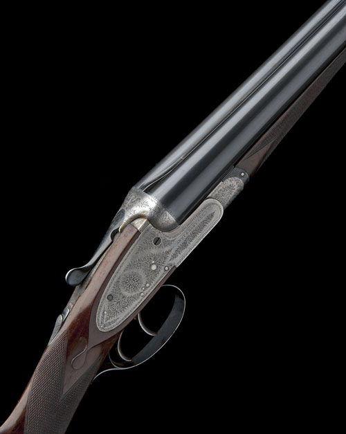 28in. nitro barrels, 2 1/2in. chambers, bored approx. true cyl. and extra full choke, automatic safety, removable striker discs, bouquet and scroll engraving, brushed bright and blued finish, 14 1/2in. figured replacement stock, weight 6lb. 9oz.