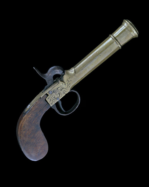 A 32-BORE PERCUSSION BRASS-BARRELLED BLUNDERBUSS PISTOL, Belgian, circa 1840, with 4in. octagonal flaring barrel, banded cannon muzzle, scroll engraved boxlock action with central iron hammer, slightly radiused slab-sided walnut butt and iron trigger-guard (some screws replaced)