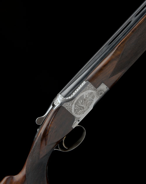 30in. nitro barrels with 16mm ventilated matt top-rib, 2 3/4in. chambers, Teague multichokes (with spares), hold-open toplever, manual safety with integral barrel selector switch, gold-washed single trigger, acanthus scroll engraving surrounding vignettes of game, silver finish, 14 1/4in. pistolgrip stock including 1in. ebonite extension, weight 7lb. 9oz.