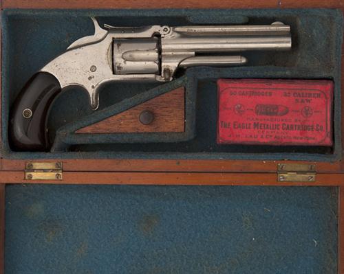 circa 1870, with round 3 1/2in. barrel, raised sighting rib with nickel-silver crescent fore-sight signed by the maker with patent dates to 1865, fluted cylinder, plain frame, two-piece rose-wood smooth grips and spur trigger, the whole retaining much original nickel finish throughout, TOGETHER WITH a later compartmented wooden travelling case and paste-board carton with a reproduction gummed label for 'THE EAGLE METALLIC CARTRIDGE CO.'.